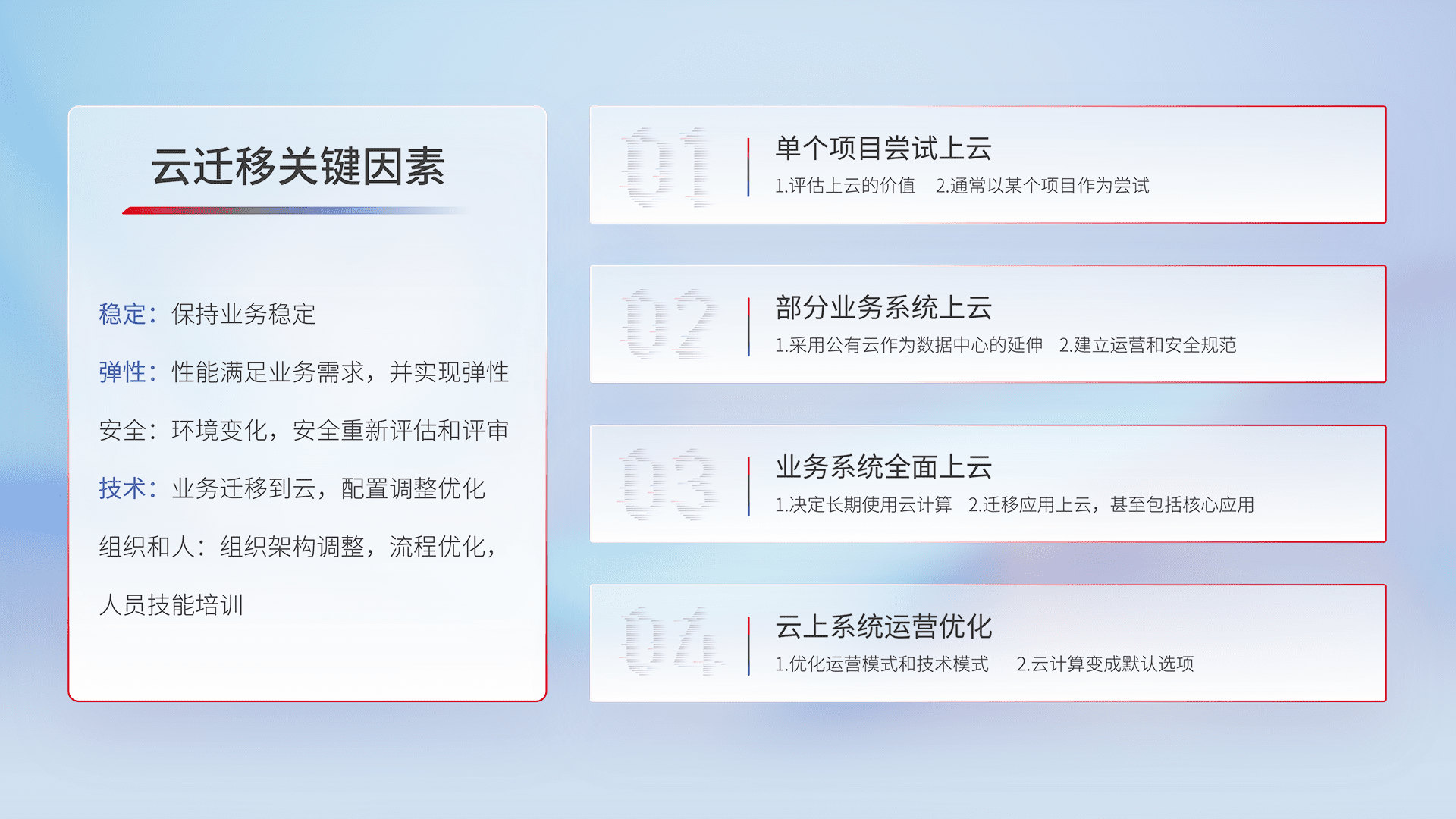 结合实际业务,,,从规划设计、、云平台选型、、云原生改造、、、数据迁移、、、集成交付,,,,迁移全过程为客户识别最佳上云路径,,,做好风险识别管理,,,,设计网络架构、、身份权限、、、、安全审计合规、、操作审计、、日志审计、、、、监控告警策略、、、、多站点容灾设计等,,对云上基础设施进行整体规划,,提升IT治理水平,,,,以满足弹性、、、、高可用、、、、高性能的需求。。